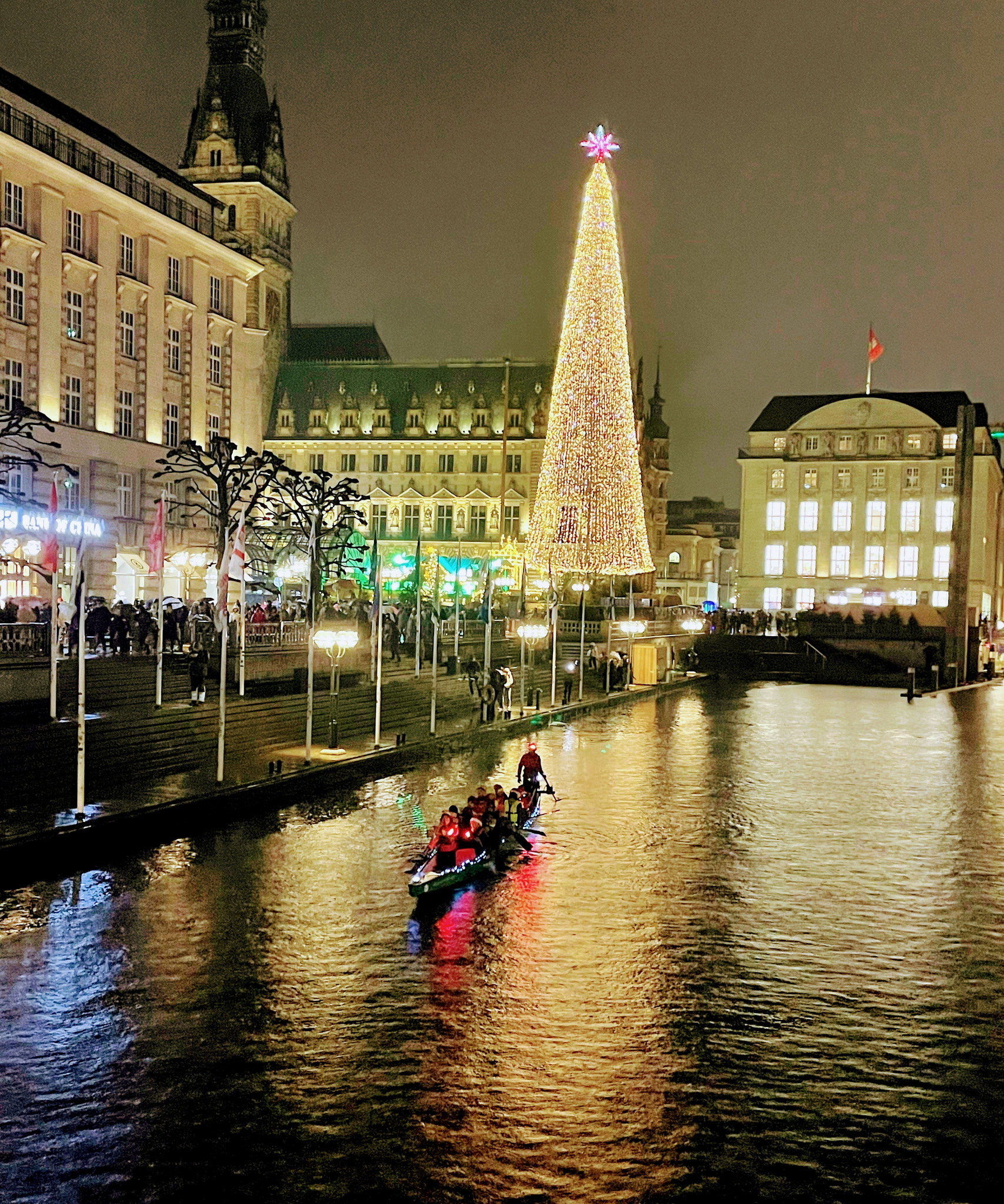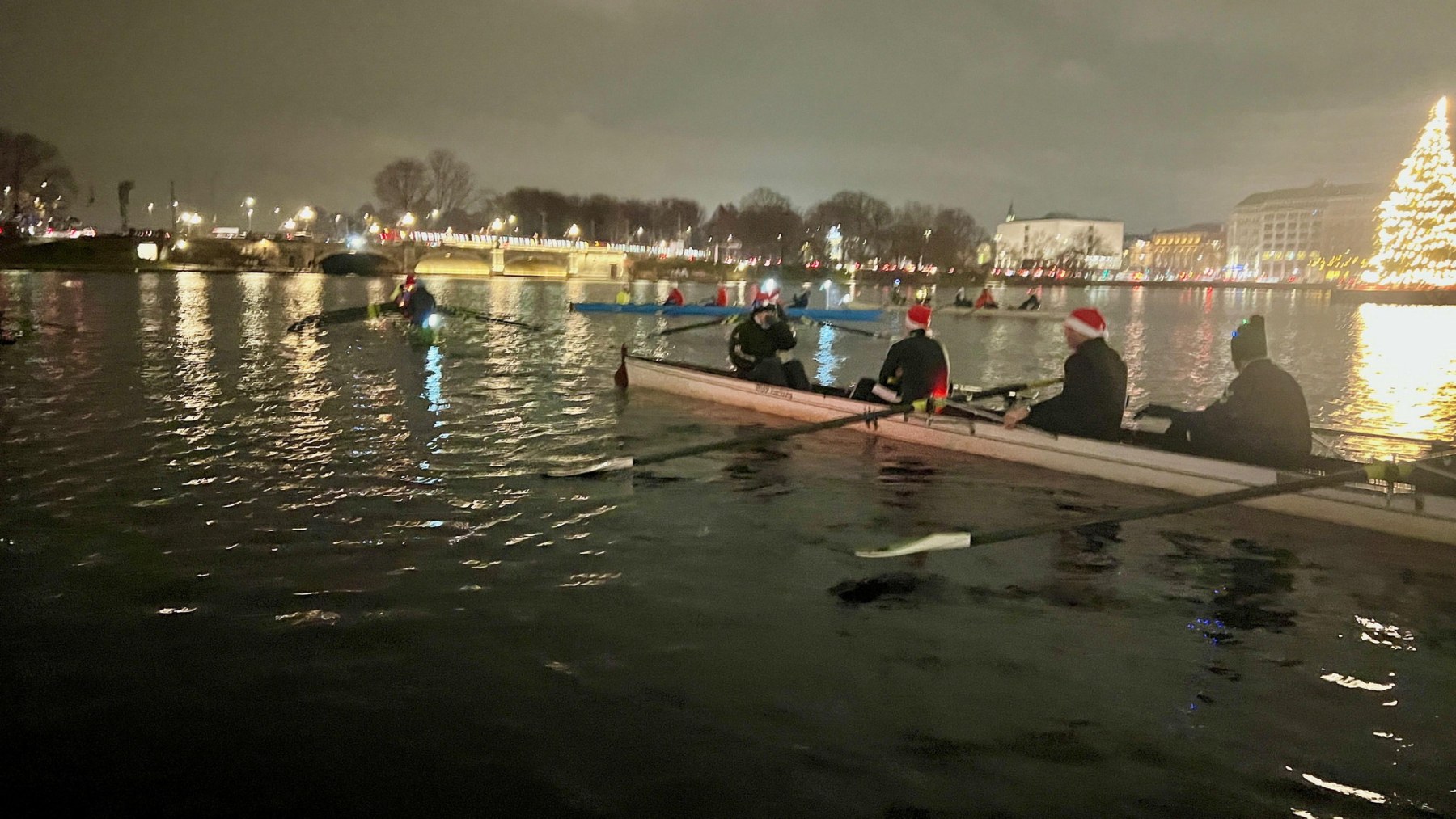 Anschließend trafen wir uns mit unseren Ruder‑Kollegen vom WSAP, die mit sechs Booten unterwegs waren, am großen Tannenbaum mitten auf der Innenalster. Dort fand das traditionelle Weihnachtssingen statt.